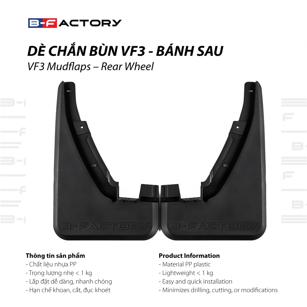 Chắn bùn VF3 B-Factory là bộ phụ kiện được lắp ở vị trí phía sau bánh xe, có nhiệm vụ hạn chế bùn đất, nước bẩn và dị vật bắn ngược lên thân xe khi di chuyển. Sản phẩm được thiết kế riêng theo kích thước và form dáng của VinFast VF3, đảm bảo lắp vừa khít, không làm ảnh hưởng đến kết cấu xe.